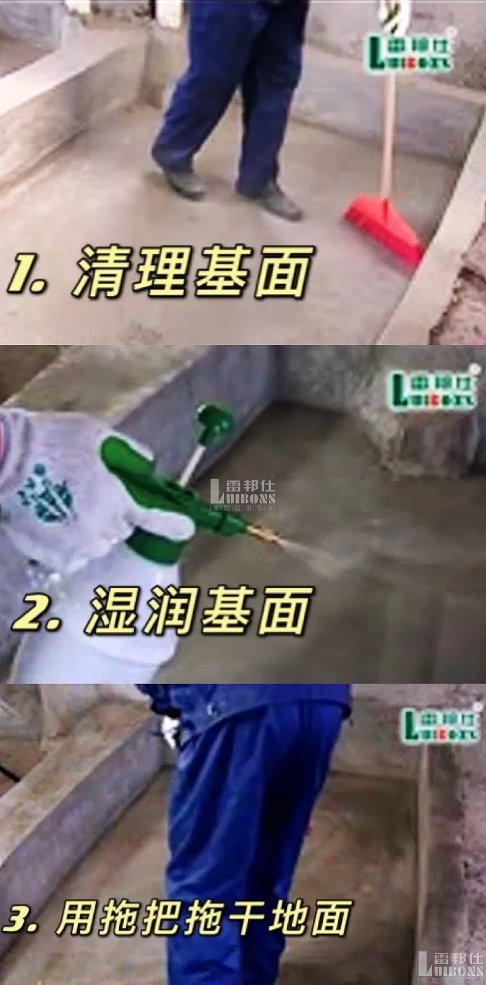 雷邦仕建議大家遵循“基面處理三步曲”,【一清理,二濕潤,三拖干】,做好防水工程的第一步!