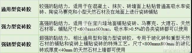 根據(jù)瓷磚膠所添加的聚合物添加劑的比例不同,瓷磚膠一般分為通用型、強(qiáng)力型和強(qiáng)韌型三種型號(hào)。不同型號(hào)黏結(jié)強(qiáng)度有所不同,適用于不同基面和不同瓷磚的鋪貼。